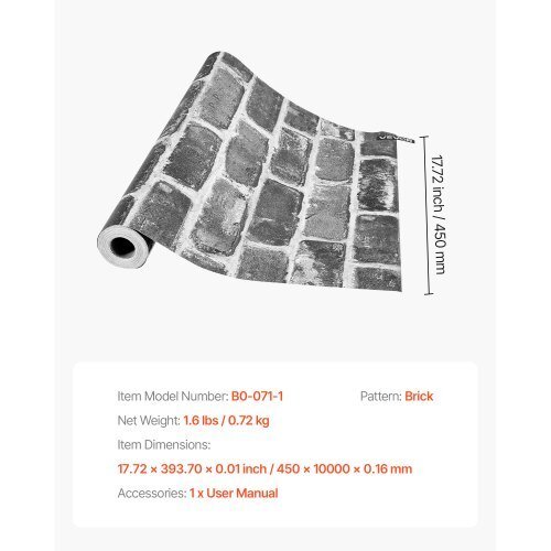 Pattern: Brick,Roll Size (W x L): 17.72 x 393.7 inch / 45cm x10m,Color: Gray,Item Model Number: B0-071-1,Item Dimensions: 17.72x 393.70 x 0.01 inch / 450 x 10000 x 0.16 mm,Net Weight: 1.6 lbs /0.72 kg,Main Material: PVC